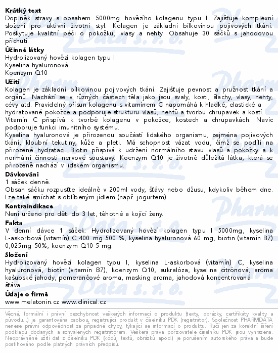 Doplněk stravy s obsahem 5000mg hovězího kolagenu typu I. Zajišťuje komplexní složení pro aktivní životní styl. Kolagen je základní bílkovinou pojivových tkání. Poskytuje kvalitní péči o pokožku, vlasy a nehty. Obsahuje 30 sáčků s jahodovou příchutí.