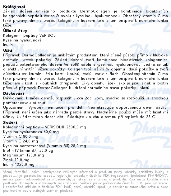 Základ složení unikátního produktu DermoCollagen je kombinace bioaktivních kolagenních peptidů Verisol® spolu s kyselinou hyaluronovou. Obsažený vitamín C má také příznivý vliv na tvorbu kolagenu v lidském těle a tím přispívá k normální funkci kůže.