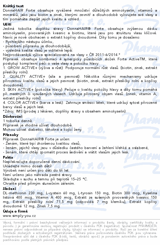 DonnaHAIR Forte obsahuje vyvážené množství důležitých aminokyselin, vitaminů a minerálů, jako jsou biotin a zinek, kterými zevnitř a dlouhodobě vyživujete své vlasy a tím pomáháte zlepšit jejich kvalitu a vzhled.