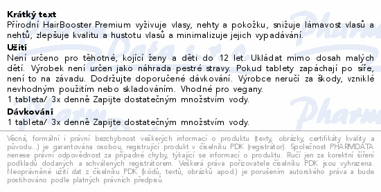 Přírodní HairBooster Premium vyživuje vlasy, nehty a pokožku, snižuje lámavost vlasů a nehtů, zlepšuje kvalitu a hustotu vlasů a minimalizuje jejich vypadávání.