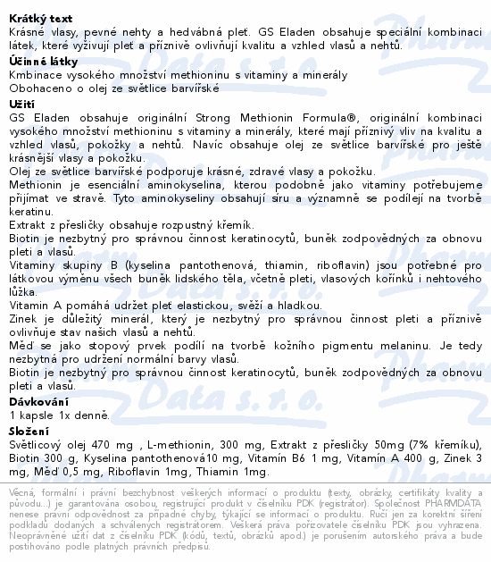 Krásné vlasy, pevné nehty a hedvábná pleť. GS Eladen obsahuje speciální kombinaci látek, které vyživují pleť a příznivě ovlivňují kvalitu a vzhled vlasů a nehtů.