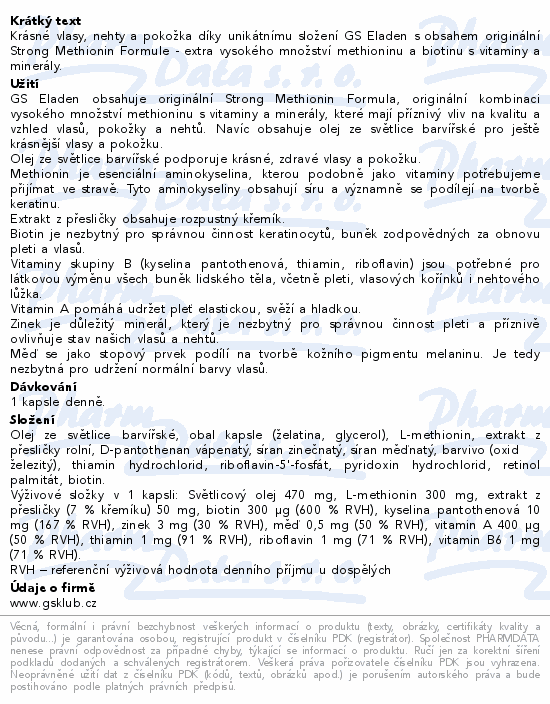 Krásné vlasy, nehty a pokožka díky unikátnímu složení GS Eladen s obsahem originální Strong Methionin Formule - extra vysokého množství methioninu a biotinu s vitaminy a minerály.