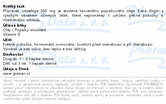 Přípravek obsahuje 500 mg za studena lisovaného pupalkového oleje Extra Virgin s vysokým obsahem účinných látek, které napomáhají k udržení pěkné pokožky a mladistvého vzhledu.