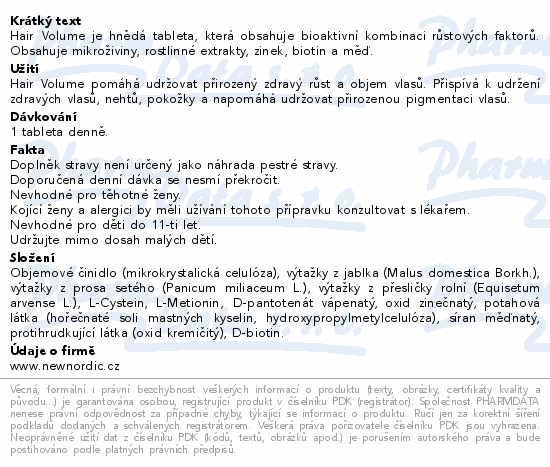 Hair Volume je hnědá tableta, která obsahuje bioaktivní kombinaci růstových faktorů. Obsahuje mikroživiny, rostlinné extrakty, zinek, biotin a měď.