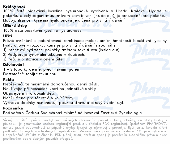 100% čistá bioaktivní kyselina hyaluronová vyrobená v Hradci Králové. Hydratuje pokožku a celý organismus směrem zevnitř ven (inside-out), je prospěšná pro pokožku, klouby, sliznice. Kyselina hyaluronová je určená pro vnitřní užívání.
