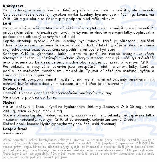 Pro mladistvý a svěží vzhled je důležitá péče o pleť nejen z vnějšku, ale i zevnitř. Celulozové kapsle obsahují vysokou dávku kyseliny hyaluronové - 100 mg, koenzymu Q10 - 30 mg a biotin se zinkem pro podporu pleti zářící zdravím.