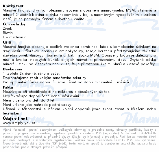 Vlasové hnojivo díky komplexnímu složení s obsahem aminokyselin, MSM, vitaminů a minerálů včetně biotinu a zinku napomáhá v boji s nadměrným vypadáváním a ztrátou vlasů, jejich pomalým růstem a špatnou kvalitou.