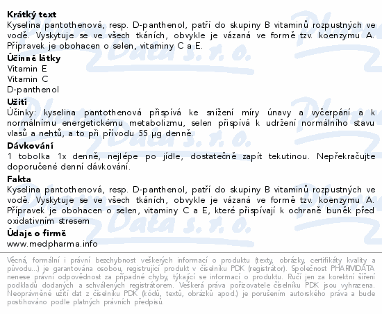 Kyselina pantothenová, resp. D-panthenol, patří do skupiny B vitaminů rozpustných ve vodě. Vyskytuje se ve všech tkáních, obvykle je vázaná ve formě tzv. koenzymu A. Přípravek je obohacen o selen, vitaminy C a E.