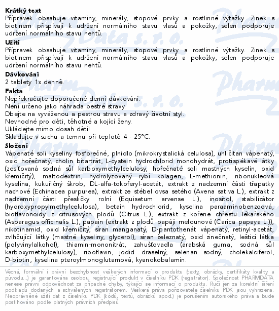 Přípravek obsahuje vitaminy, minerály, stopové prvky a rostlinné výtažky. Zinek s biotinem přispívají k udržení normálního stavu vlasů a pokožky, selen podporuje udržení normálního stavu nehtů.