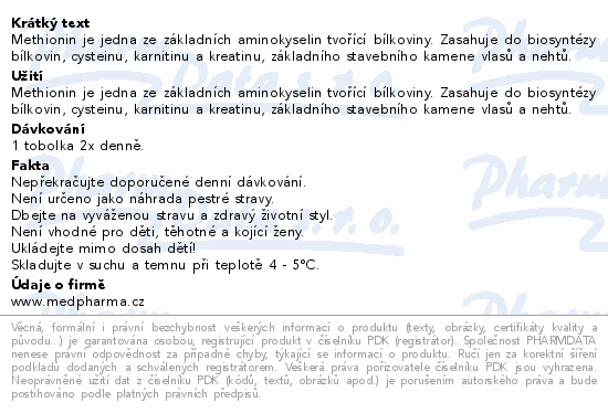 Methionin je jedna ze základních aminokyselin tvořící bílkoviny. Zasahuje do biosyntézy bílkovin, cysteinu, karnitinu a kreatinu, základního stavebního kamene vlasů a nehtů.