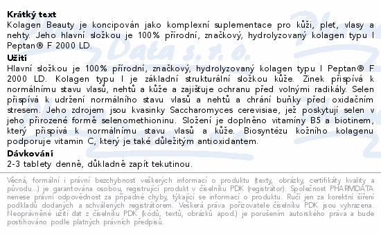 Kolagen Beauty je koncipován jako komplexní suplementace pro kůži, pleť, vlasy a nehty. Jeho hlavní složkou je 100% přírodní, značkový, hydrolyzovaný kolagen typu I Peptan® F 2000 LD.