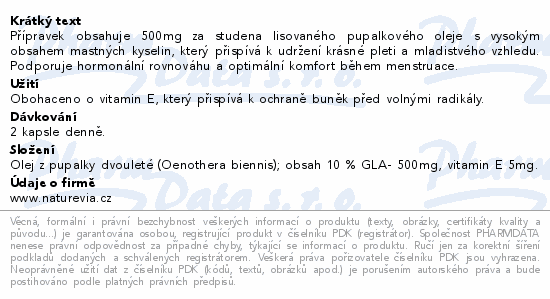 Přípravek obsahuje 500mg za studena lisovaného pupalkového oleje s vysokým obsahem mastných kyselin, který přispívá k udržení krásné pleti a mladistvého vzhledu. Podporuje hormonální rovnováhu a optimální komfort během menstruace.