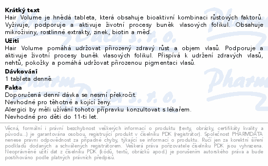 Hair Volume je hnědá tableta, která obsahuje bioaktivní kombinaci růstových faktorů. Vyživuje, podporuje a aktivuje životní procesy buněk vlasových folikul. Obsahuje mikroživiny, rostlinné extrakty, zinek, biotin a měď.