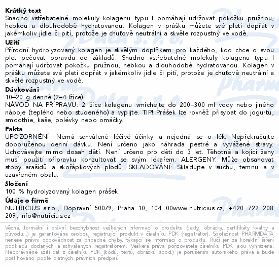Snadno vstřebatelné molekuly kolagenu typu I pomáhají udržovat pokožku pružnou, hebkou a dlouhodobě hydratovanou. Kolagen v prášku můžete své pleti dopřát v jakémkoliv jídle či pití, protože je chuťově neutrální a skvěle rozpustný ve vodě.