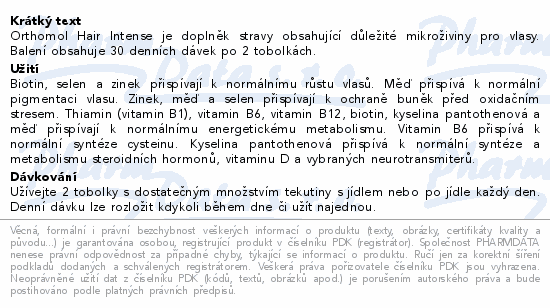 Orthomol Hair Intense je doplněk stravy obsahující důležité mikroživiny pro vlasy. Balení obsahuje 30 denních dávek po 2 tobolkách.