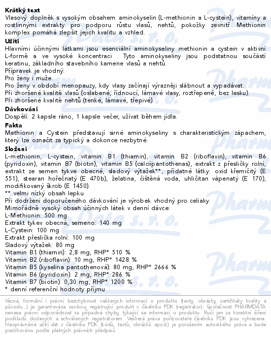 Vlasový doplněk s vysokým obsahem aminokyselin (L-methionin a L-cystein), vitamíny a rostlinnými extrakty pro podporu růstu vlasů, nehtů, pokožky zevnitř. Methionin komplex pomáhá zlepšit jejich kvalitu a vzhled.