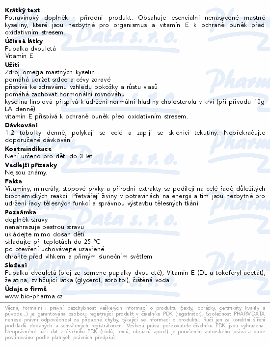 Potravinový doplněk - přírodní produkt. Obsahuje esencialní nenasycené mastné kyseliny, které jsou nezbytné pro organismus a vitamín E k ochraně buněk před oxidativním stresem.