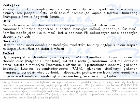 Vlasový doplněk s adaptogeny, vitamíny, minerály, aminokyselinami a rostlinnými extrakty pro podporu růstu vlasů zevnitř. Kombinujte kapsle s Revalid Stimulating Shampoo a Revalid Regrowth Serum.
