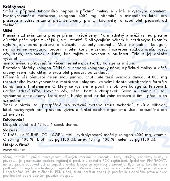 Směs k přípravě lahodného nápoje s příchutí maliny a višně s vysokým obsahem hydrolyzovaného mořského kolagenu 4000 mg, vitaminů a minerálních látek pro pružnou a zdravím zářící pleť. Je určený pro ty, kdo chtějí o svou pleť pečovat od základů.