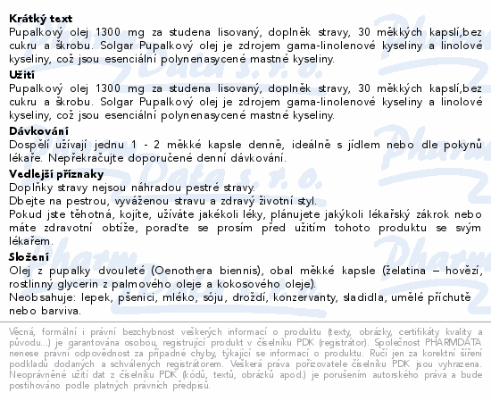 Pupalkový olej 1300 mg za studena lisovaný, doplněk stravy, 30 měkkých kapslí,bez cukru a škrobu. Solgar Pupalkový olej je zdrojem gama-linolenové kyseliny a linolové kyseliny, což jsou esenciální polynenasycené mastné kyseliny.