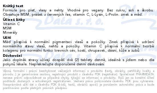Formule pro pleť, vlasy a nehty. Vhodné pro vegany. Bez cukru, soli a škrobu. Obsahuje MSM, prášek z červených řas, vitamín C, L-Lysin, L-Prolin. zinek a měď.
