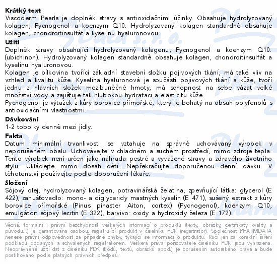 Doplněk stravy na bázi hydrolyzovaného kolagenu, piknogenolů a koenzymu Q10. Viscoderm pearls je vhodný pro znovunastolení rovnováhy ve funkčních vlastnostech kůže.