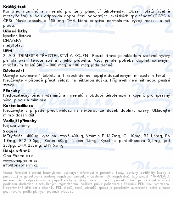 Komplex vitamínů a minerálů pro ženy plánující těhotenství. Obsah folátů (včetně methylfolátu) a jódu odpovídá doporučení odborných lékařských společností (ČGPS a ČES). Navíc obsahuje 250 mg DHA která přispívá normálnímu vývoji mozku a očí plodu.
