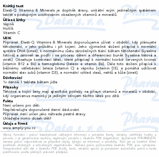 Elasti-Q Vitamins & Minerals je doplněk stravy, unikátní svým jedinečným systémem tablet s postupným uvolňováním obsažených vitaminů a minerálů.