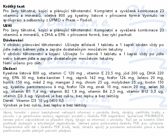Pro ženy těhotné, kojící a plánující těhotenství. Kompletní a vyvážená kombinace 23 vitaminů a minerálů, včetně 800 µg kyseliny listové v přirozené formě Vyvinuto ve spolupráci s odborníky z ÚPMD v Praze – Podolí.