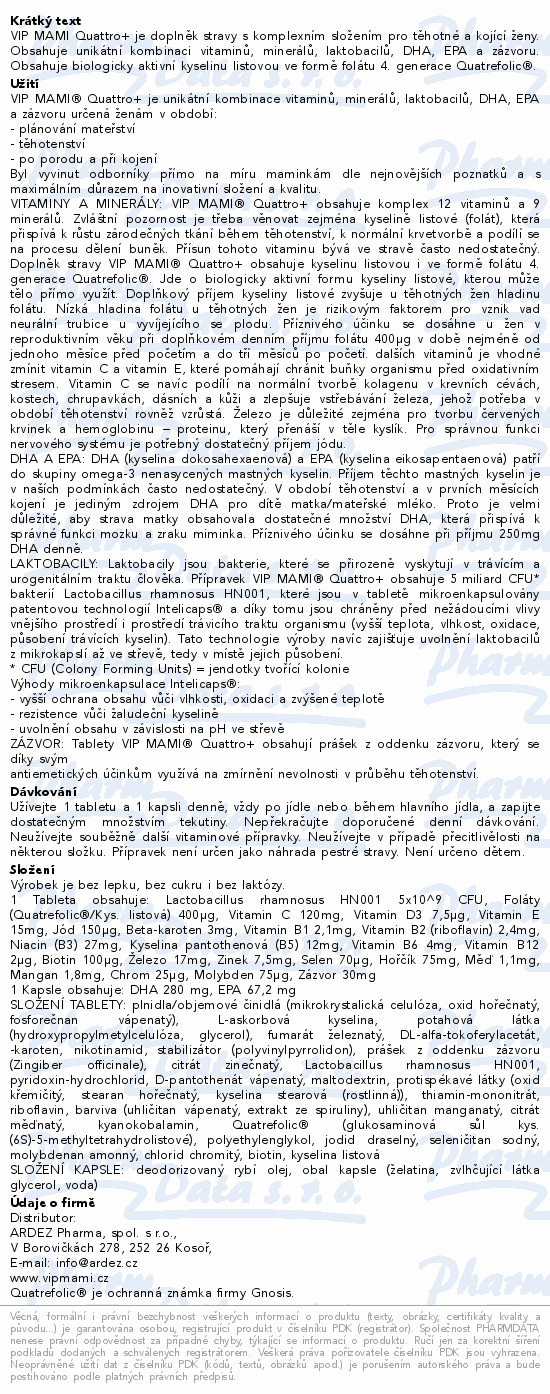 VIP MAMI Quattro+ je doplněk stravy s komplexním složením pro těhotné a kojící ženy. Obsahuje unikátní kombinaci vitaminů, minerálů, laktobacilů, DHA, EPA a zázvoru. Obsahuje biologicky aktivní kyselinu listovou ve formě folátu 4. generace Quatrefolic®.