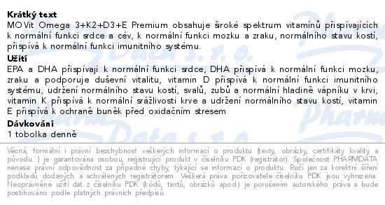 MOVit Omega 3+K2+D3+E Premium obsahuje široké spektrum vitamínů přispívajících k normální funkci srdce a cév, k normální funkci mozku a zraku, normálního stavu kostí, přispívá k normální funkci imunitního systému.