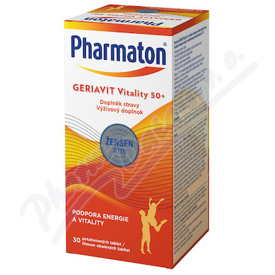 Pharmaton GERIAVIT Vitality 50+ je vědecky vyvinutý, vyvážený doplněk stravy obsahující vitamíny, minerály a standardizovaný výtažek ženšenu G115, který pomáhá udržovat vytrvalost, pocit energie a vitality, fyzické a psychické pohody.