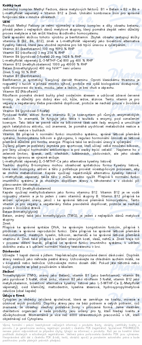 Jedinečný komplex Methyl Factors, dárce metylových faktorů: B1 + Betain + B2 + B6 + L-methylfolát vápenatý + Vitamin B12 a Zinek. Unikátní kombinace živin pro správné fungování těla v mnoha oblastech.