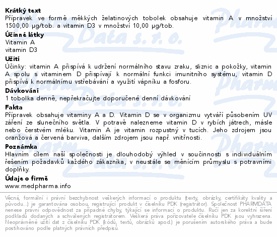 Přípravek ve formě měkkých želatinových tobolek obsahuje vitamin A v množství 1500,00 µg/tob. a vitamin D3 v množství 10,00 µg/tob.
