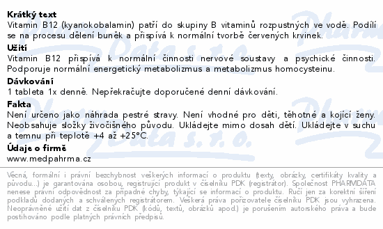 Vitamin B12 (kyanokobalamin) patří do skupiny B vitaminů rozpustných ve vodě. Podílí se na procesu dělení buněk a přispívá k normální tvorbě červených krvinek.