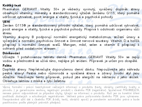 Pharmaton GERIAVIT Vitality 50+ je vědecky vyvinutý, vyvážený doplněk stravy obsahující vitamíny, minerály a standardizovaný výtažek ženšenu G115, který pomáhá udržovat vytrvalost, pocit energie a vitality, fyzické a psychické pohody.