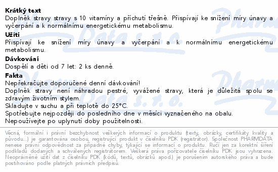 Doplněk stravy stravy s 10 vitamíny a příchutí třešně. Přispívají ke snížení míry únavy a vyčerpání a k normálnímu energetickému metabolismu.
