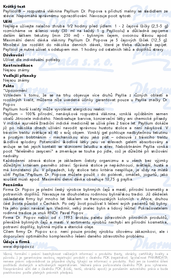 Psyllicol® – rozpustná vláknina Psyllium Dr. Popova s příchutí maliny se sladidlem ze stévie. Napomáhá správnému vyprazdňování. Navozuje pocit sytosti.