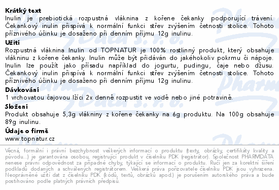 Inulin je prebiotická rozpustná vláknina z kořene čekanky podporující trávení. Čekankový inulin přispívá k normální funkci střev zvýšením četnosti stolice. Tohoto příznivého účinku je dosaženo při denním příjmu 12g inulinu.