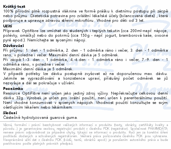 Dávkování: jedna odměrka (5 g) do 200 ml tekutiny nebo 150 g jídla. Pokud je to potřeba dávky se zvyšují postupně. až na doporučenou maximální dávku (5 odměrek denně). OptiFibre je zcela bez lepku, laktózy i fruktózy.
