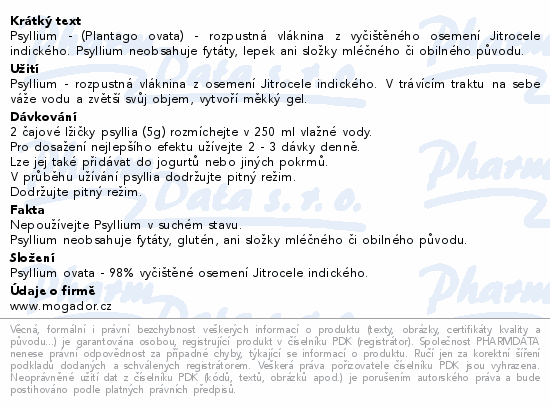 Psyllium - (Plantago ovata) - rozpustná vláknina z vyčištěného osemení Jitrocele indického. Psyllium neobsahuje fytáty, lepek ani složky mléčného či obilného původu. Maximální možná dosažitelná čistota produktu 98%.