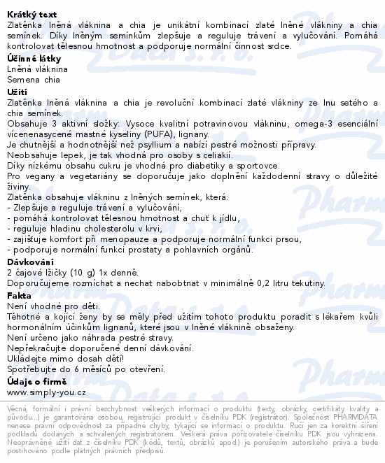 Zlatěnka lněná vláknina a chia je unikátní kombinací zlaté lněné vlákniny a chia semínek. Díky lněným semínkům zlepšuje a reguluje trávení a vylučování. Pomáhá kontrolovat tělesnou hmotnost a podporuje normální činnost srdce.