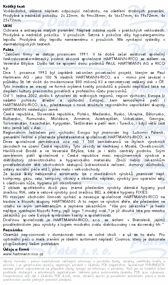 Voděodolné, dělené náplasti odpuzující nečistotu, na ošetření drobných poranění. Prodyšná a nedráždí pokožku. 2x 22mm, 4x 9mx38mm, 4x 16x57mm, 6x 19x72mm, 4x 25x72mm.