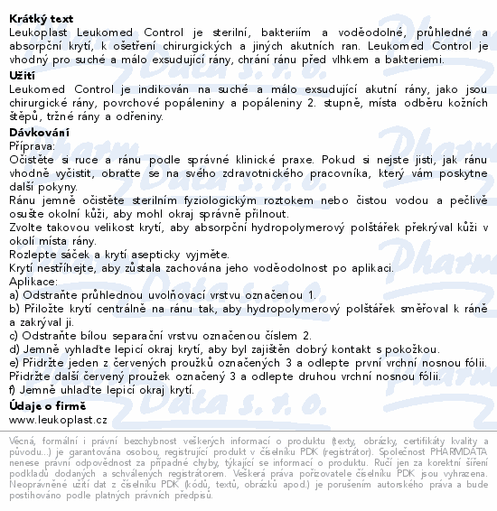 Leukoplast Leukomed Control je sterilní, bakteriím a voděodolné, průhledné a absorpční krytí, k ošetření chirurgických a jiných akutních ran. Leukomed Control je vhodný pro suché a málo exsudující rány, chrání ránu před vlhkem a bakteriemi.