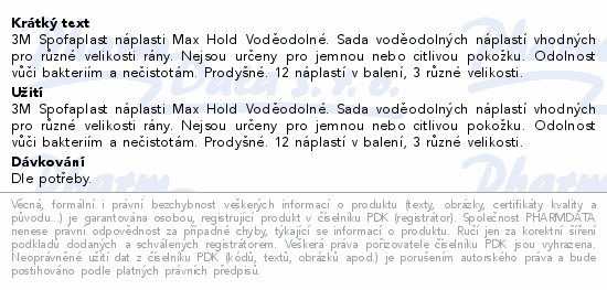 3M Spofaplast náplasti Max Hold Voděodolné. Sada voděodolných náplastí vhodných pro různé velikosti rány. Nejsou určeny pro jemnou nebo citlivou pokožku. Odolnost vůči bakteriím a nečistotám. Prodyšné. 12 náplastí v balení, 3 různé velikosti.