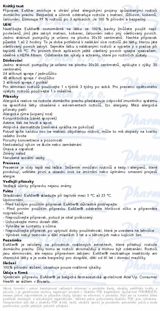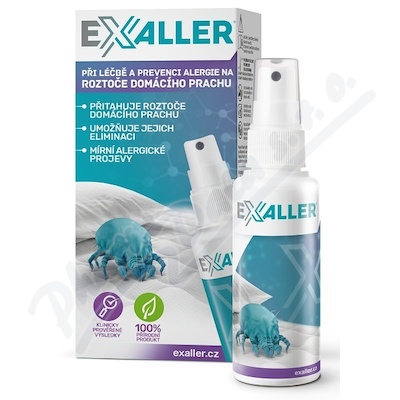 Přípravek ExAller zmírňuje a chrání před alergickými projevy způsobenými roztoči domácího prachu. Bezpečně a účinně odstraňuje roztoče z matrací, lůžkovin, koberců, čalounění. Eliminuje 99 % roztočů po 3 aplikacích. Je 100 % přírodní a bezpečný.