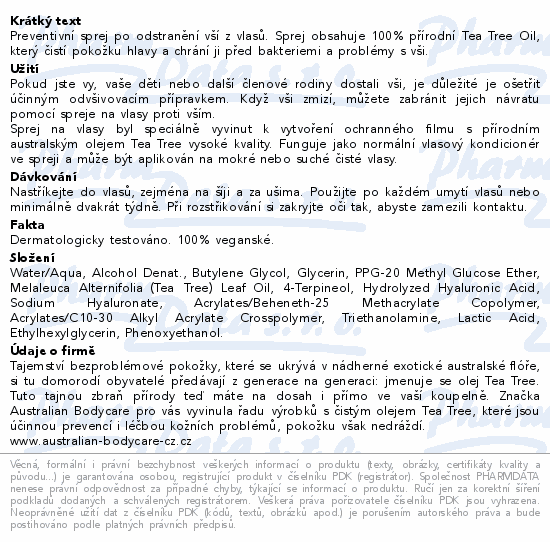 Australian Bodycare Preventivní sprej proti vším na vlasy a pokožku hlavy je speciálně vyvinutý sprej, který má za úkol minimalizovat riziko napadení vší dětskou. Je ideální pro každodenní použití, zejména v obdobích, kdy jsou děti vystaveny zvýšenému riziku (např. ve školkách, školách, na táborech).