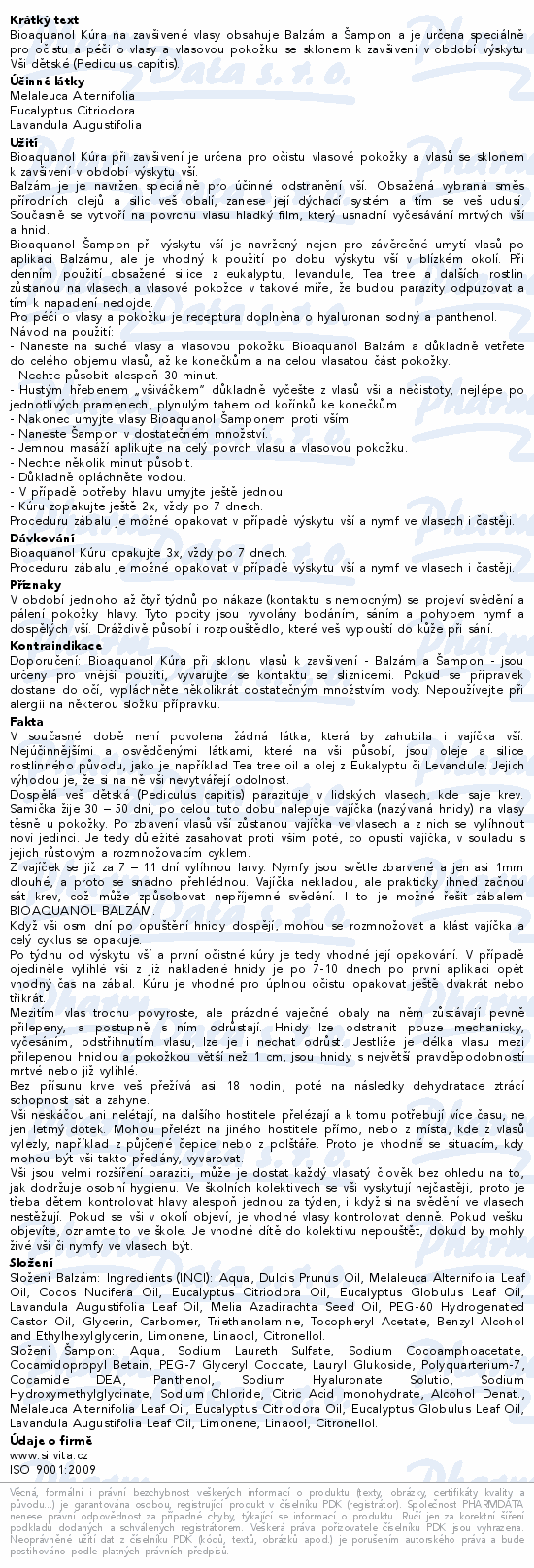 Bioaquanol kúra proti vším je komplexní sada, která využívá přírodních látek pro odstranění vší a hnid z vlasů a vlasové pokožky. Kombinuje balzám, jemný šampon a speciální hustý hřeben. Přípravky jsou vhodné pro děti i dospělé a díky šetrnému složení jsou dobře snášeny i při opakovaném použití.