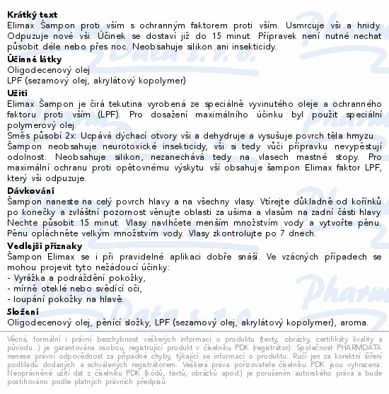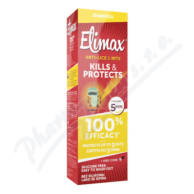 Elimax Šampon proti vším s ochranným faktorem proti vším. Usmrcuje vši a hnidy. Odpuzuje nové vši. Účinek se dostaví již do 15 minut. Přípravek není nutné nechat působit déle nebo přes noc. Neobsahuje silikon ani insekticidy.