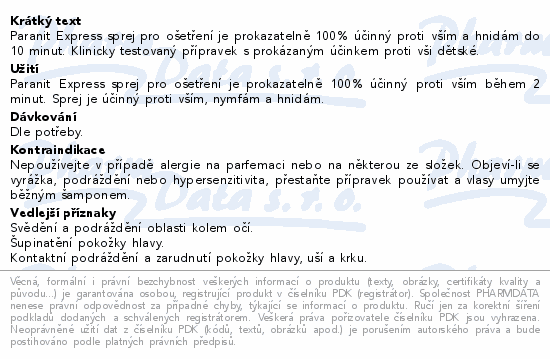 Paranit Express sprej pro ošetření je prokazatelně 100% účinný proti vším a hnidám do 10 minut. Klinicky testovaný přípravek s prokázaným účinkem proti vši dětské.